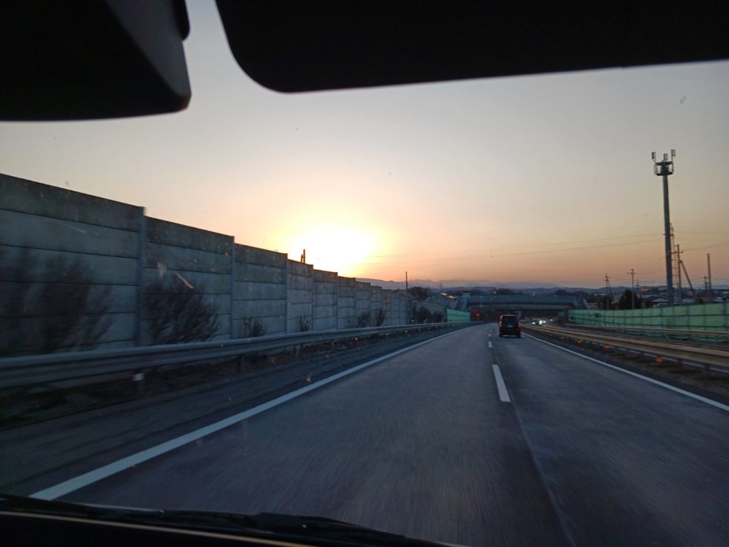 佐久市の辺りで日没で、夕焼けに。